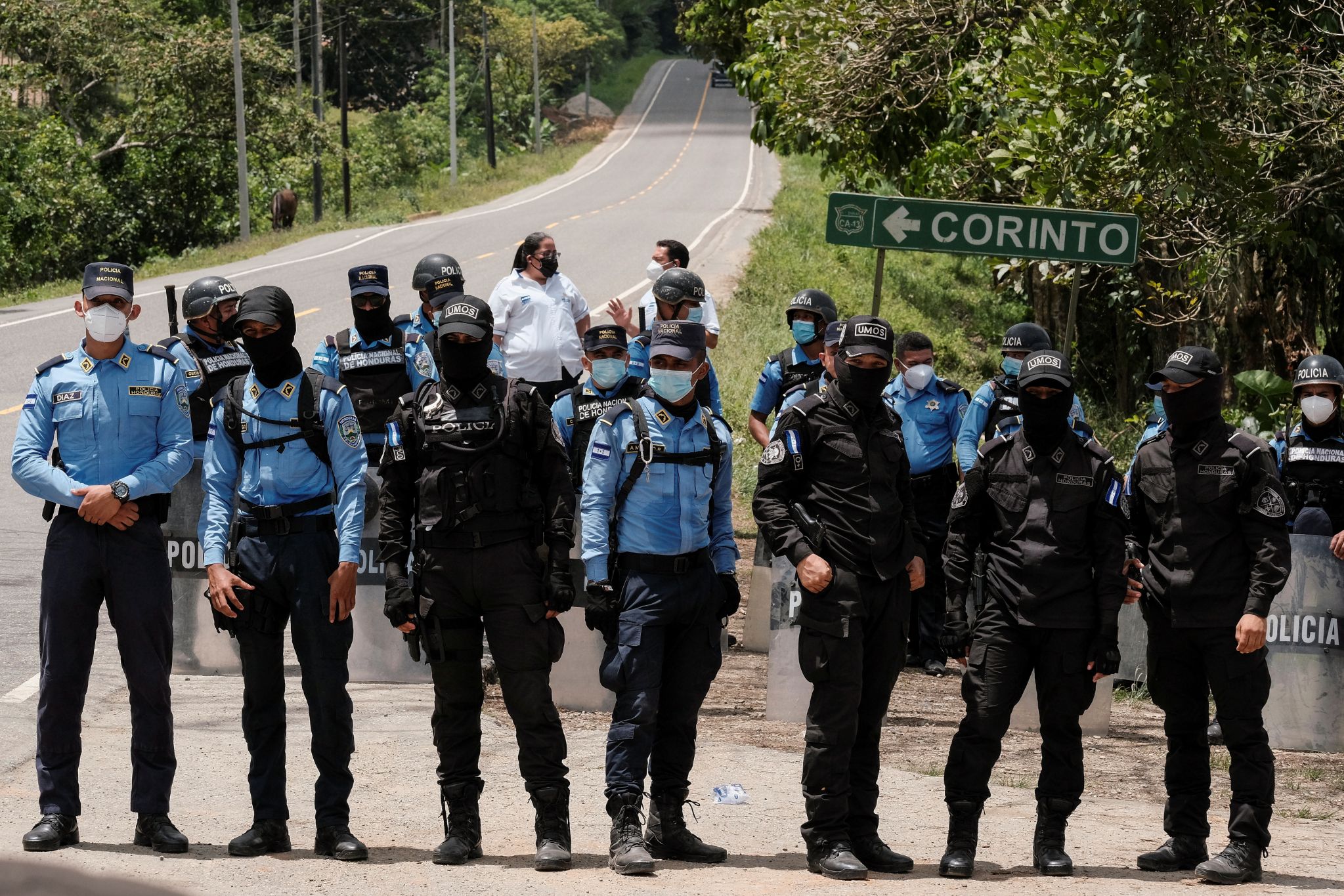 La policía de Honduras estableció un puesto de control en la carretera cerca del cruce fronterizo Corinto y quienes no tenían la documentación requerida fueron conducidos de regreso en autobuses a San Pedro Sula, de dónde partió el grupo por la mañana, dijo el testigo de Reuters.