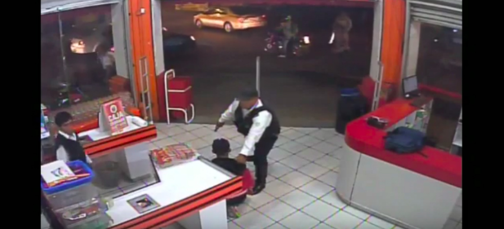 En ellos se observa cómo el uniformado llega a la tienda, con el asalto en proceso e intenta someter a uno de los delincuentes.