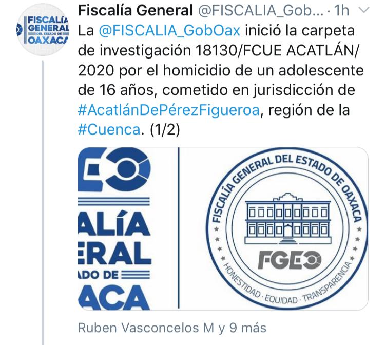 Al respecto, la Fiscalía General del Estado de Oaxaca (FGEO) en su cuenta de Twitter informó que inició una carpeta de investigación 18130/FCUE/ACATLÁN/2020 por el homicidio del adolescente de 16 años, cometido en la jurisdicción del municipio de Acatlán Pérez Figueroa en la región de la cuenca del Papaloapan.