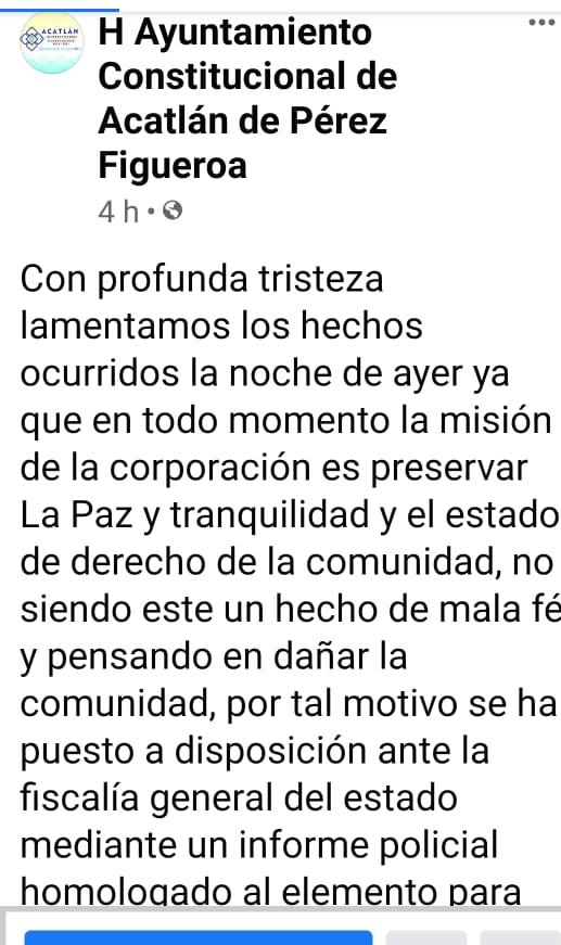 En la cuenta oficial de Facebook del Ayuntamiento Municipal de Acatlán Pérez Figueroa que preside Adán José Maciel Sosa de extracción panista, manifestó: “Con profunda tristeza lamentamos los hechos ocurridos la noche de ayer, ya que en todo momento la misión de la corporación es preservar la paz y la tranquilidad y el estado de derecho de la comunidad, no siendo este un hecho de mala fé y pensando en dañar a la comunidad, por tal motivo se ha puesto a disposición ante la Fiscalía General del Estado mediante un informe policial para esclarecer lo ocurrido”.