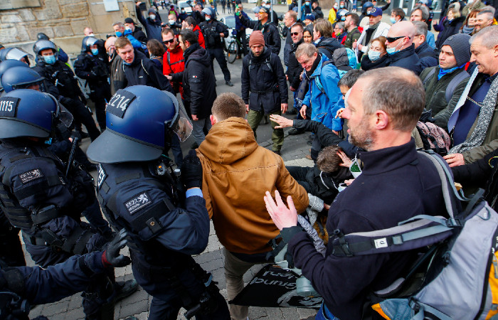 La policía utilizó este sábado cañones de agua y spray de pimienta durante una protesta de unas 20,000 personas contra el confinamiento y otras restricciones por el coronavirus en el centro de Alemania que se puso violenta, ya que algunos manifestantes lanzaron botellas contra los efectivos.