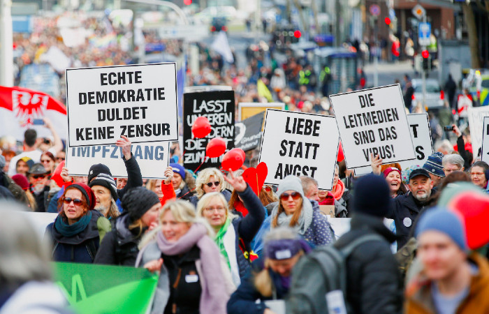 Los asistentes a la protesta llevaban carteles que decían: “no queremos vacunación obligatoria” y “la democracia no tolerará la censura”.