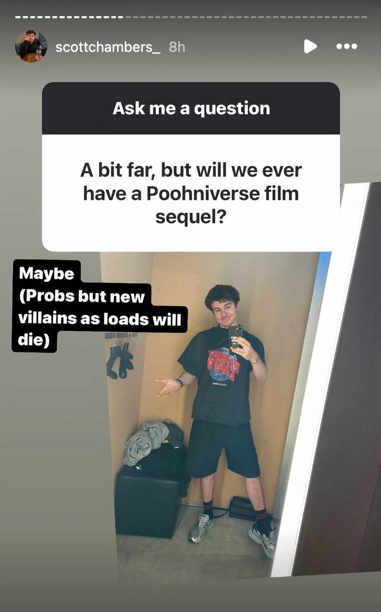 El productor, director y estrella de Twisted Childhood Universe, Scott Chambers, respondió recientemente una serie de preguntas de los fanáticos en Instagram, que incluyen “¿Tendremos alguna vez una secuela de la película Poohniverse??” En respuesta, compartió una selfie con la leyenda “Tal vez (Problemas, pero nuevos villanos ya que muchos morirán)“. Esto parecería indicar que ya se han tenido discusiones sobre la franquicia cruzada y lo que está en juego para los villanos de Twisted Childhood en el próximo título de 2025. Vea una captura de pantalla de la historia de Instagram a continuación: