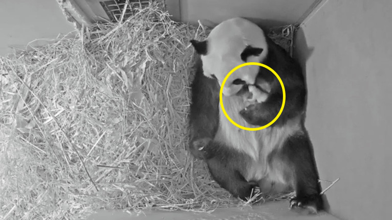 “Inmediatamente después del nacimiento, la madre Wu Wen asumió su papel de madre. Desde la primera hora, mantuvo a su criatura caliente y lo cuidó. La madre Wu Wen también está bien. De vez en cuando come una manzana, un pedazo de pastel e incluso un tallo de bambú. También duerme mucho, junto con su cría, que se ubica principalmente cerca de uno de los cuatro pezones”.