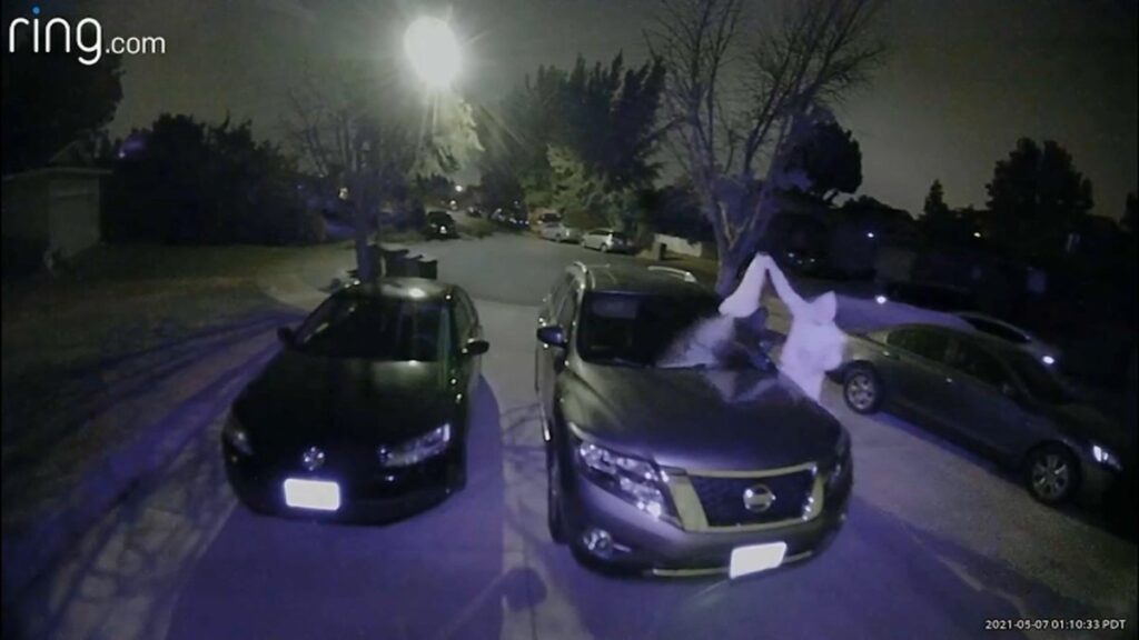 Cámaras de seguridad de la vivienda ubicada en Raintree Court captaron el lunes alrededor de la 1:00 a.m., a un hombre vestido con una sudadera y capucha, vaciando una bolsa llena de excrementos en el parabrisas de una camioneta.