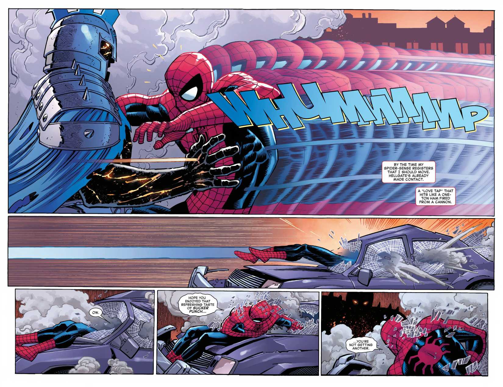 Hit por un “toque de amor” de Hellgate antes de que pueda reaccionar, Spider-Man es enviado de cabeza al parabrisas de un automóvil cercano, con el monólogo interno de Spidey señalando cómo, “Para cuando mis registros de sentido de araña me muden, Hellgate ya ha hecho contacto”. Dando a los fanáticos directamente que Hellgate es oficialmente más rápido que el sentido de Spider-Man.