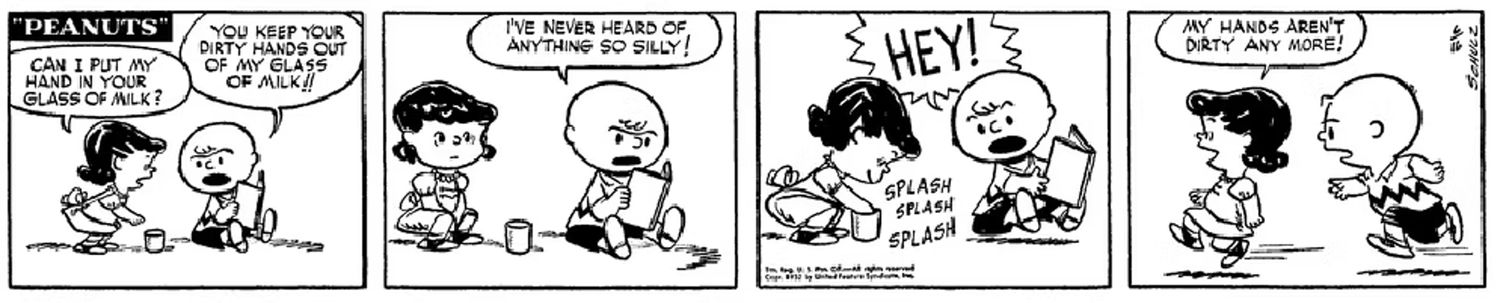 Una tira más antigua de la obra maestra de Charles M. Schulz, el cómic presenta a Lucy van Pelt haciéndole a Charlie Brown la pregunta muy extraña: “¿Puedo poner mi mano en tu vaso de leche?