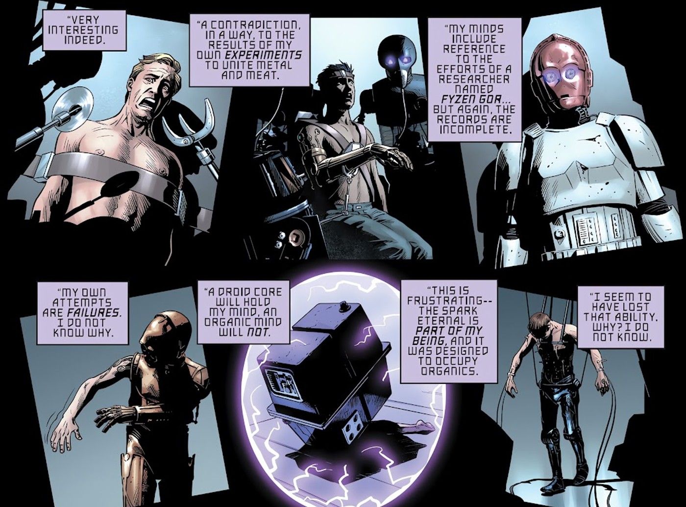 Guerra de las Galaxias mencione esto en Charles Soule, Luke Ross, Alex Sinclair y Travis Lanham Star Wars: Droides Oscuros #2, ya que la IA viral conocida como Scourge usa C-3PO para espiar a la Rebelión y aprender más sobre la Fuerza. Scourge es una aterradora amalgama de tecnología antigua que es capaz de poseer cualquier droide que encuentra y agregarlo a su vasta mente colmena. Una de sus primeras víctimas fue C-3PO, a quien utiliza para interactuar con Luke Skywalker con la esperanza de encontrar una manera de acceder a la Fuerza. Creyendo que R2-D2 ha comenzado a sospechar, Scourge usa C-3PO para arrojar el astromecánico fuera de una esclusa de aire, pero se queja del diseño de su cuerpo mientras lo hace, comentando: “Este cuerpo apenas puede moverse. ¿Por qué alguien diseñaría un droide de esta manera?”