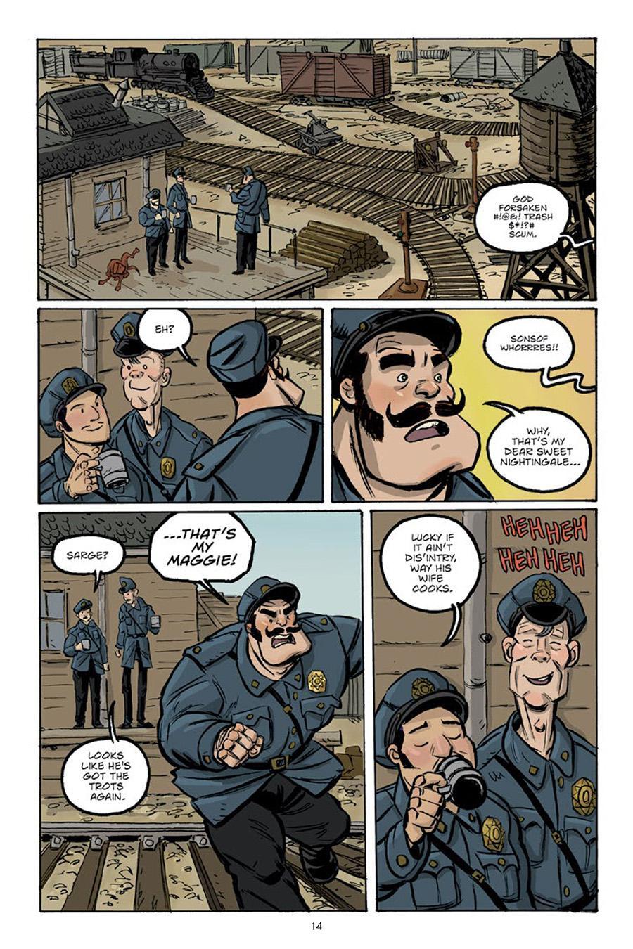 "¡Dinosaurios! ¡Cierto! Olvidé que Joe es un experimentado dibujante de dinosaurios. Creo que la calidad prehistórica realmente viene con el dolor rojo", dijo Blair. "Quería que el libro tuviera la calidad de una aventura de fantasía: héroes deshonestos que enfrentaban a varios monstruos viciosos a lo largo de su viaje. La mayoría de las veces, aquí, eran monstruos humanos, pero esta era una oportunidad divertida de tener una bestia real para la batalla. "