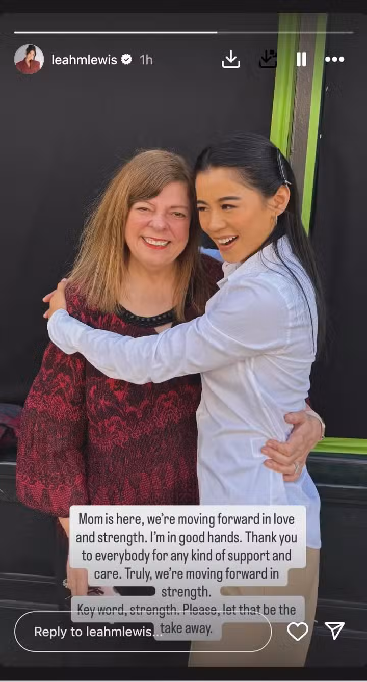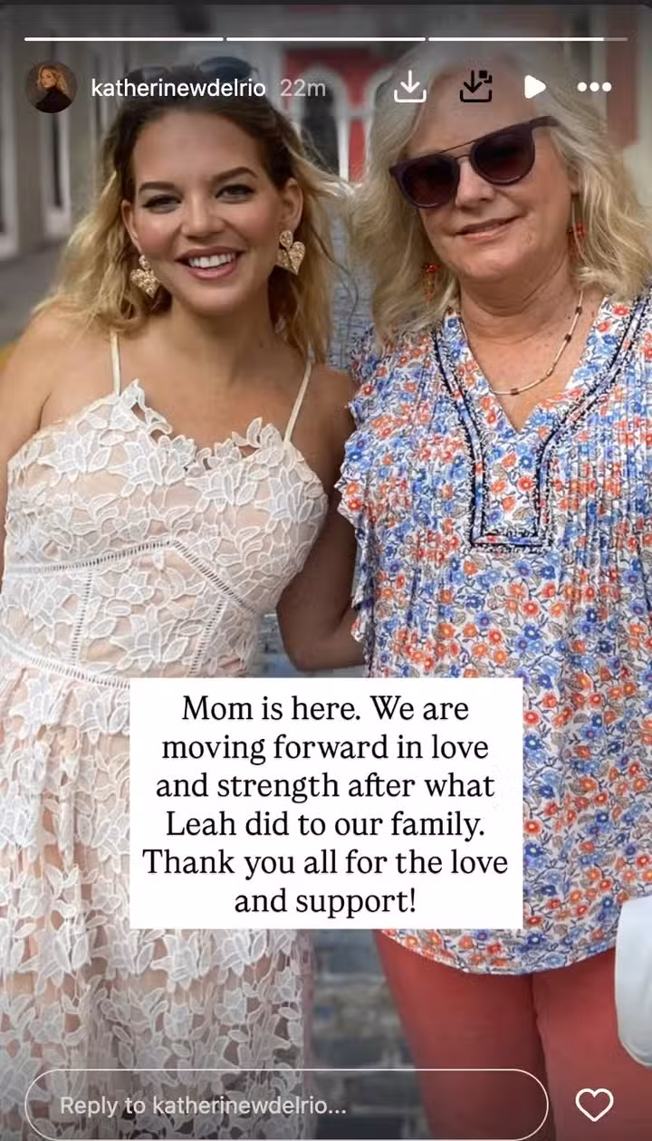 Poco después publicó otra historia de Instagram que imitaba la de Lewis. La historia contenía una foto de Del Rio y su madre, y la leyenda “Mamá está aquí. Seguimos adelante con amor y fortaleza después de lo que Leah le hizo a nuestra familia. ¡Gracias a todos por el amor y el apoyo!“