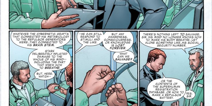 La eliminación de la lista de registro de superhumanos condujo a la aparente muerte de Iron Man, pero el héroe no se quedó muerto. En cambio, el cerebro de Iron Man simplemente se reinició hasta un punto antes de que el Guerra civil evento, reiniciando efectivamente al personaje con su heroísmo intacto y todas las acciones de villano límite que tomó durante Guerra civil borrado de su pasado. Si bien el propio Iron Man no murió, la versión de él que estaba en desacuerdo con el Capitán América estaba básicamente muerta, dejando solo la versión heroica de Tony con la que Steve se asoció inicialmente tras su inclusión con los Vengadores. Debido a que Iron Man estaba dispuesto a sacrificar su propia vida por la seguridad de los demás, y la versión de él que quedó después no era el mismo hombre que su enemigo en Civil War, el Capitán América pudo perdonar a Iron Man y los dos se convirtieron rápidamente. socios superhéroes una vez más.