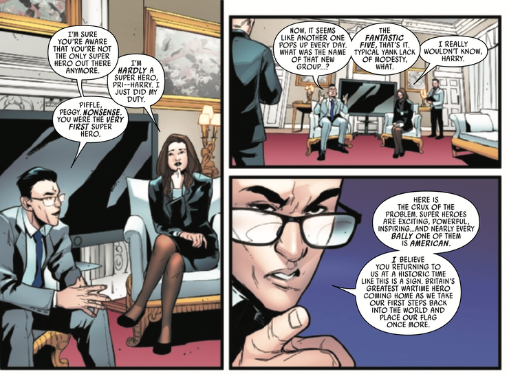 Cuando el Capitán Carter revive del hielo (a diferencia de ella ¿Y si…? de Marvel Contraparte de Disney+, no fue transportada a la era moderna a través de un portal), conoce al Primer Ministro en el Reino Unido. Desde entonces, se enteró de que está lejos de ser el único superhéroe que existe, y para disgusto del primer ministro, “… casi todos los cojones de ellos son estadounidenses”. Él cree que el regreso de Carter es una señal de que el Reino Unido está preparado para ascender a la prominencia en el escenario mundial una vez más (e incluso ofrece un traje nuevo y más moderno para sus superhéroes en el futuro).