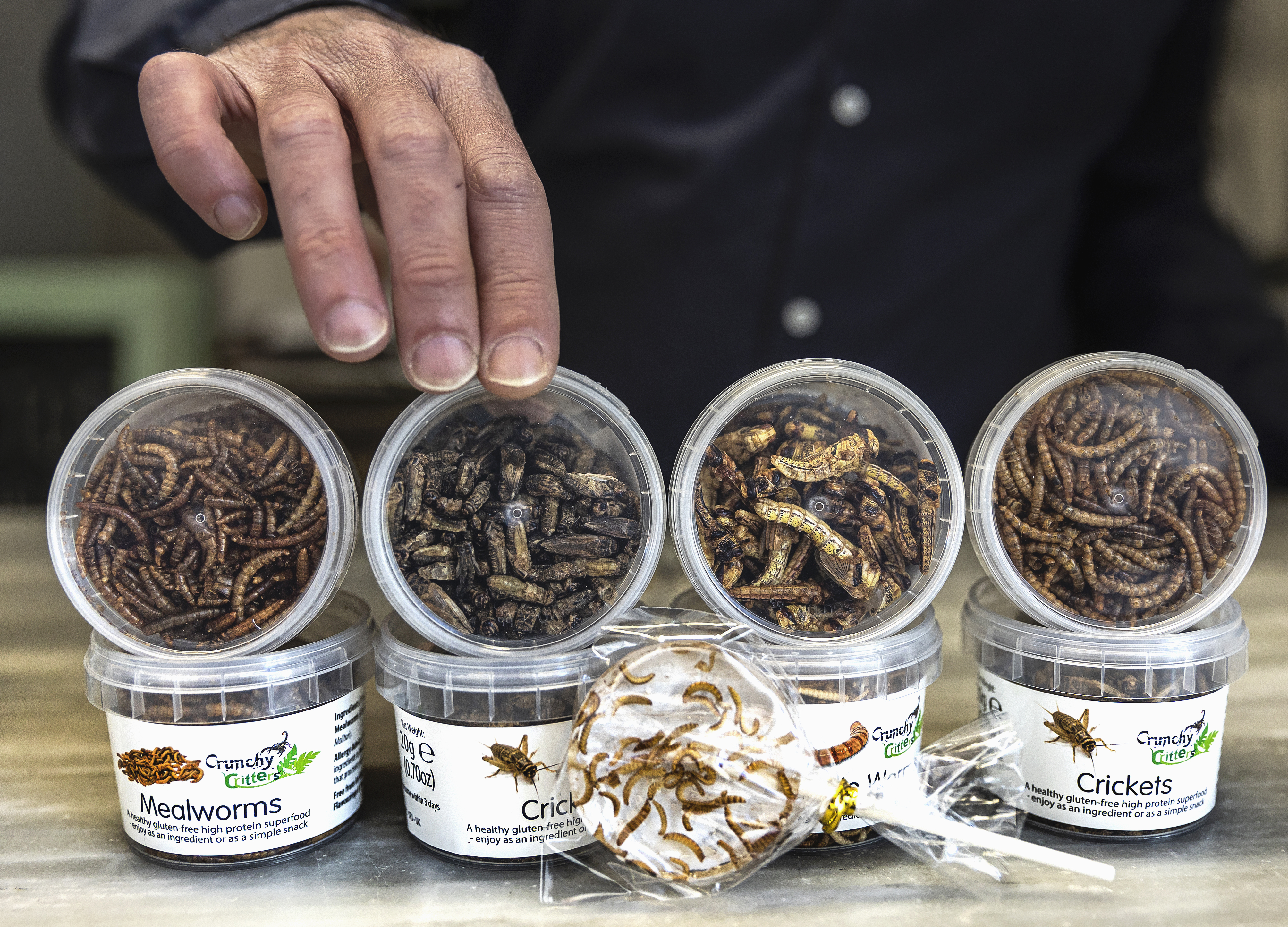En su escaparate hay piruletas hechas con gusanos y otras exquisiteces elaboradas con bichos: nachos, macarrones, barritas energéticas, suplementos de proteínas y hasta paté de berenjena con grillos. “Alguna gente pone cara de asco, pero otros ven interesante la experiencia y se atreven a probarlos”. El año pasado vendió unos 2.000 paquetes de estos bichos, alrededor de unos 20 kilos en total. Dice que hasta le compró una muestra el Ejército español.