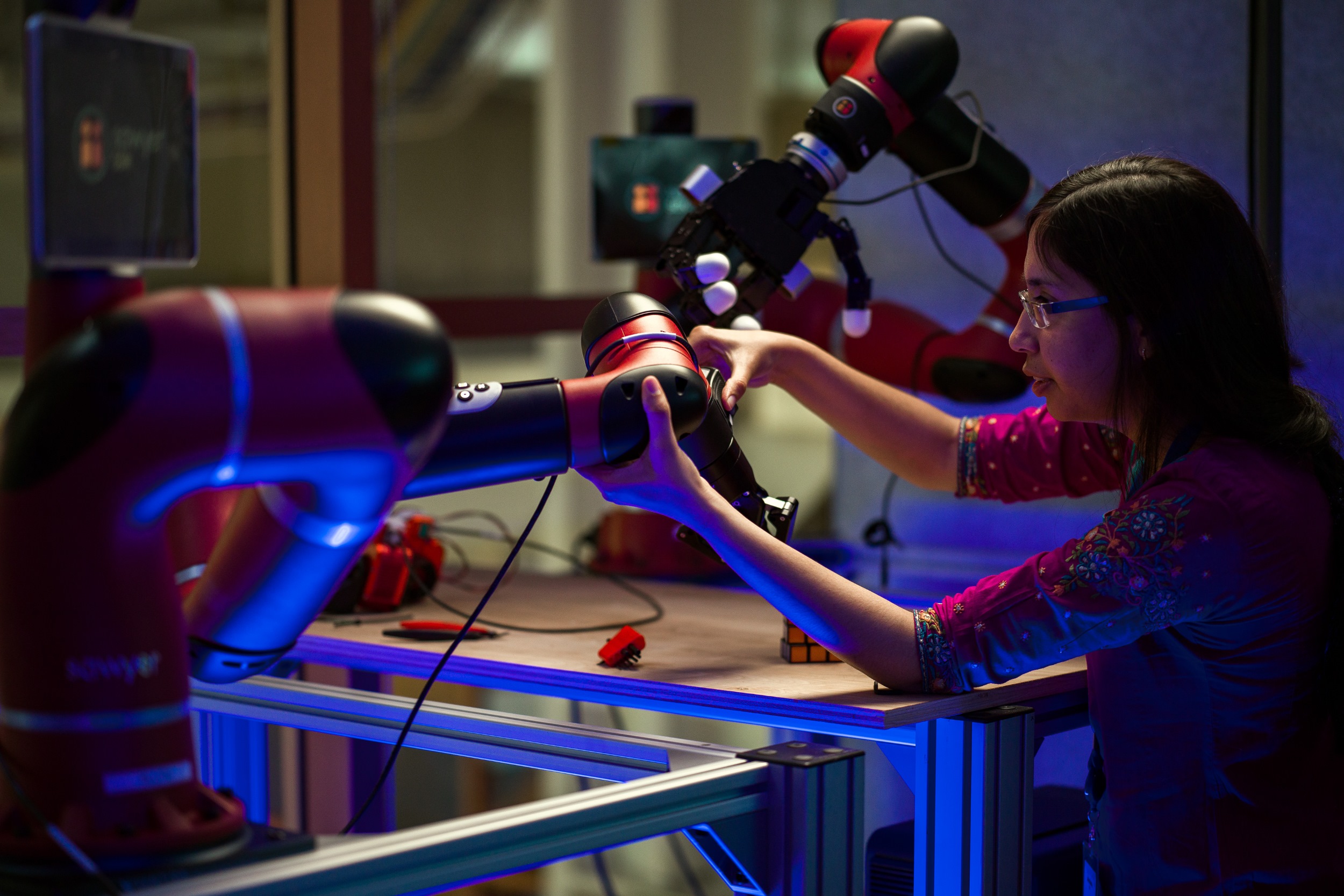 El investigador Akshara Rai ajusta un brazo robótico en el laboratorio de robótica AI en Menlo Park. (Facebook)