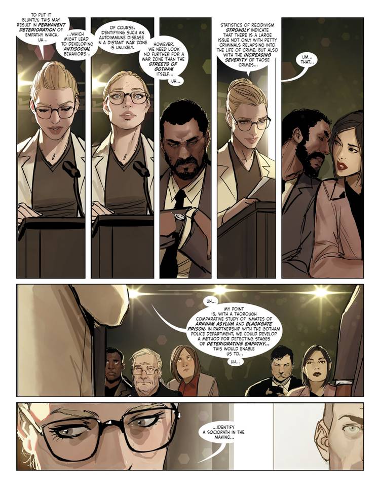Una de las cosas principales que Harleen aprende sobre los delincuentes de guerra con los que habla es que sus cerebros han cerrado efectivamente su capacidad para procesar la empatía. Como explica Harleen, cuando alguien está en medio de una guerra, ver al combatiente enemigo como humano podría hacer que un soldado dude en disparar sobre ellos. Esta vacilación podría no ser recíproca por el enemigo. Es más fácil luchar en la guerra y mantenerse con vida al no ver al enemigo como un ser humano. Es una versión más fuerte de la respuesta de lucha o huida, y Harleen cree que ha estado afectando a Gotham City y sus ciudadanos, que solo quieren sobrevivir en un lugar terrible.