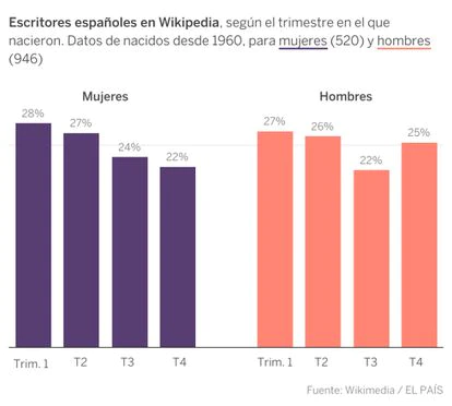 El trabajo de Soria y Beneito con las notas de selectividad encontraba que el efecto cumpleaños era mayor en las niñas, lo que resulta intrigante, porque lo vimos también en nuestros datos de diputadas o escritoras. Es un ángulo menos estudiado, según explican. Pero es inevitable pensar en sexismo: no es difícil imaginar familias que empujan más a sus hijos que a sus hijas a la hora de estudiar, o que celebran los éxitos de ellos por encima de los de ellas.