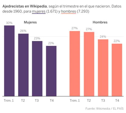 Por último, pensé en una categoría especial de competidores: los jugadores de ajedrez. La disciplina tiene predilección por los niños prodigio, ¿puede ser una ventaja ser de los mayores de tu año? Saqué los datos de 9.000 ajedrecistas profesionales, esta vez de todo el mundo, y me encontré uno de los patrones más claros: hay bastantes más ajedrecistas del primer trimestre que del cuarto. Y otra vez el efecto es mayor en mujeres, como ocurre con las diputadas y escritoras.