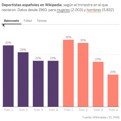 También confirmé el efecto cumpleaños en más deportes, como el baloncesto. Entre los baloncestistas españoles que salen en Wikipedia, hay el doble del primer primer trimestre que del cuarto, que es una brecha tremenda. Nacer el 31 de diciembre reduce tus opciones a la mitad. (Buscar casos concretos es exagerar, pero de los hermanos Gasol, el único que no llegó a profesional fue el pequeño, que nació en octubre; Pau es de julio y Marc de enero.)