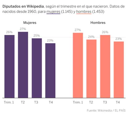 Entre los políticos, el efecto cumpleaños parece verse sobre todo en las mujeres. Aunque cada mes nacen más o menos los mismos niños, entre las diputadas hay un 10% o 15% más del principio de año.