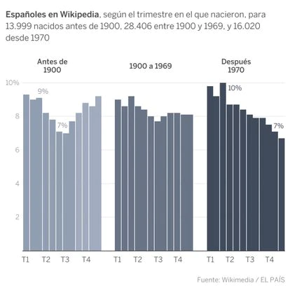 Obsérvese primero el siglo XX. El efecto cumpleaños se volvió mucho más evidente en la segunda mitad. No quiero elucubrar mucho, pero quizás ahora es más importante lo que haces en la escuela. (Si naciste en 1600, para salir en Wikipedia igual importaba más nacer noble.)