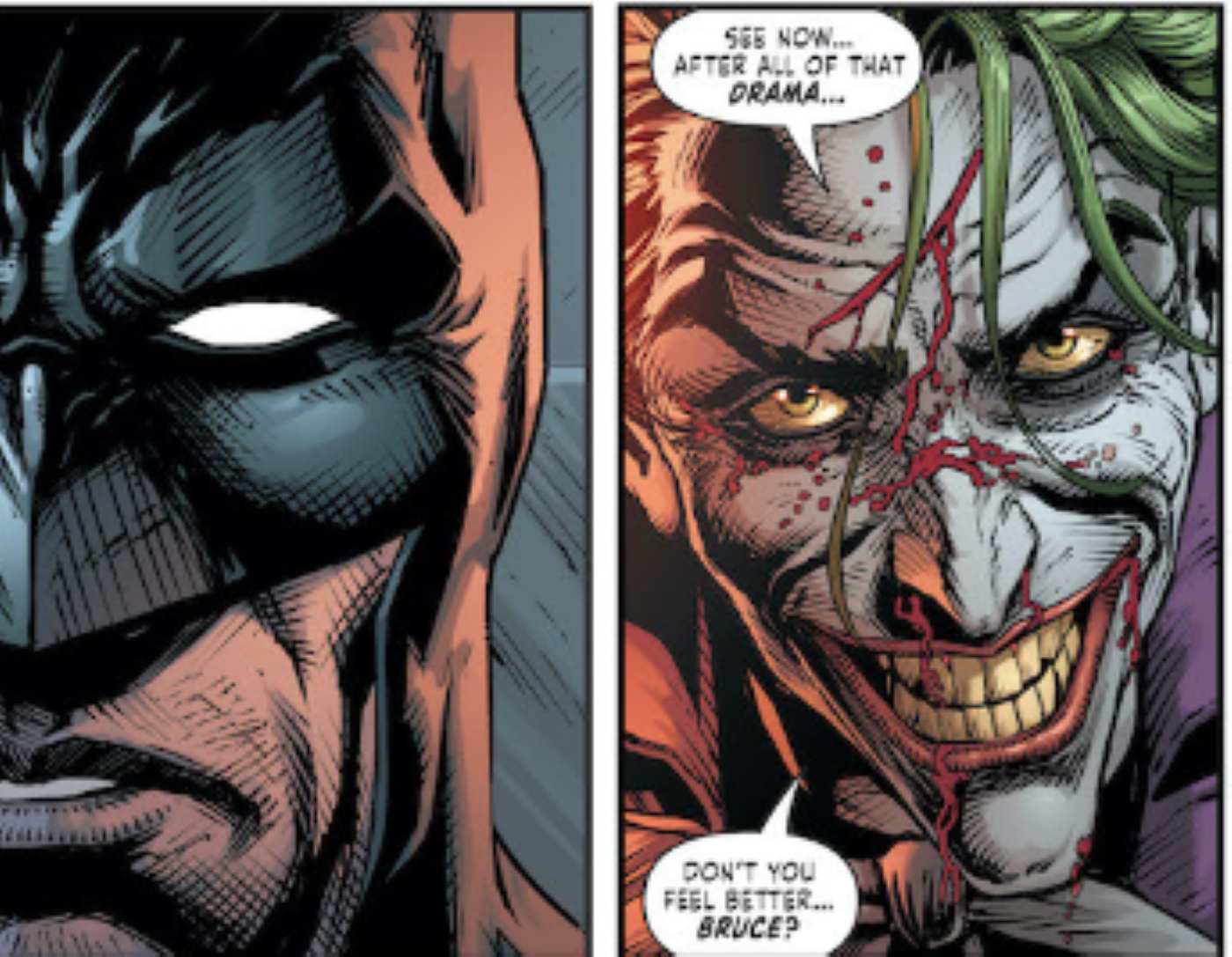 Batman: Tres comodines El número 3, de Geoff Johns, Jason Fabok, Brad Anderson y Rob Leigh, presentó un momento sorprendente, en el que Joker finalmente admite conocer la identidad secreta de Batman. Por supuesto, a la revelación le sigue otro giro: él promete no revelarlo nunca.