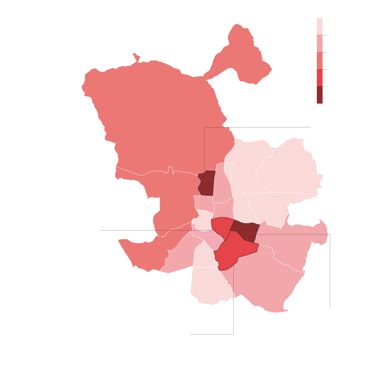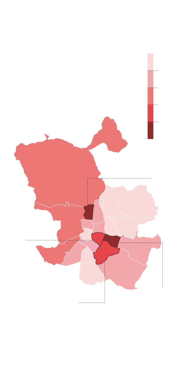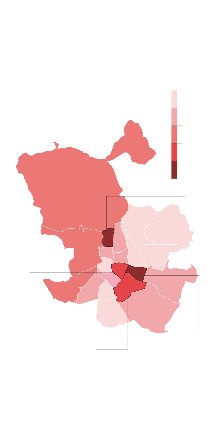 En Madrid, aunque los datos escasean, vemos que los distritos más afectados son Moratalaz, Tetuán y Puente de Vallecas, zonas tradicionalmente obreras, pero el cuarto es Retiro, más adinerado. Parece más afectada la zona sur de la Comunidad de Madrid, con Leganés a la cabeza, aunque los números por distritos y municipios son demasiado burdos para afinar el análisis. Estas zonas más afectadas, junto a Alcalá de Henares y Fuencarral-El Pardo (barrio del Pilar), albergan al 8% de la población total de la región, pero suponen el 15% del total de los casos confirmados, según un análisis de la Universidad Politécnica de Madrid. El investigador Pedro Gullón ha observado correlación entre mayor nivel de hacinamiento y menor precio de alquiler con las zonas de más contagios de la capital.