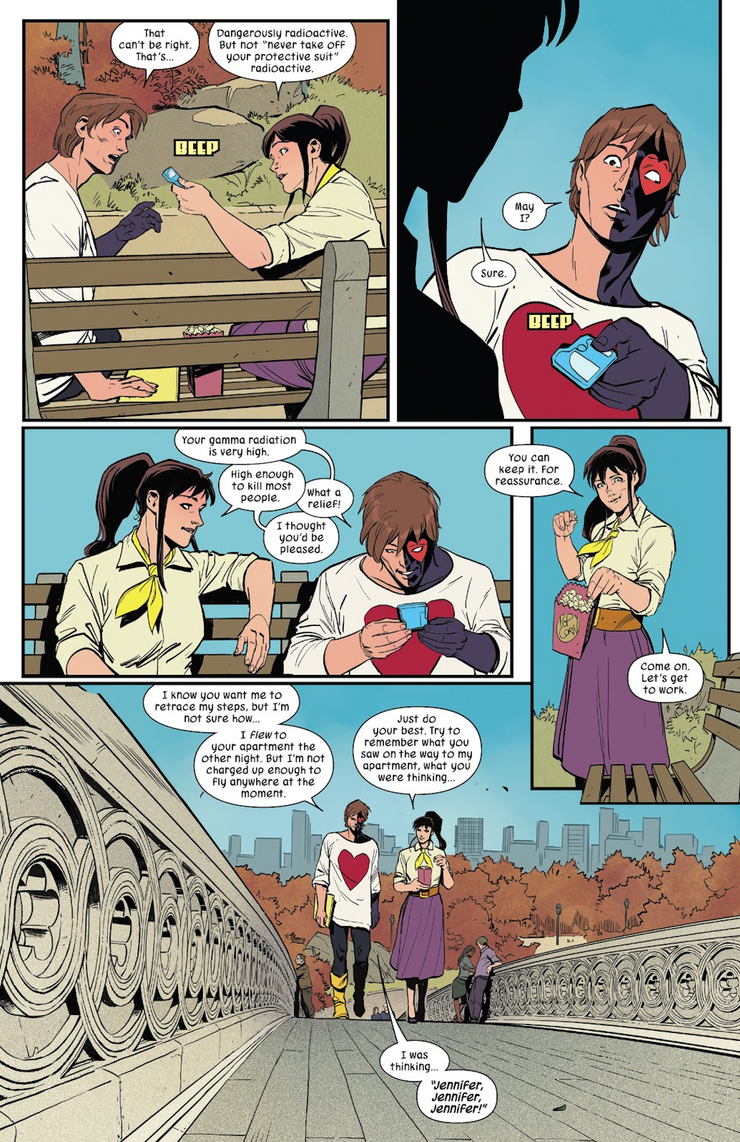 En Ella-Hulk # 4, escrito por Rainbow Rowell con arte de Luca Maresca, Jennifer Walters recibe un detector de radiación de Reed Richards (después de que este último busca ayuda legal en su oficina, junto con muchos otros superhéroes). Más tarde ese día, el amigo de She-Hulk, Jack of Hearts (quien es él mismo radiactivo), examina a She-Hulk y ve algo sorprendente. “Tu radiación gamma es muy alta”. “Lo suficientemente alto como para matar a la mayoría de las personas”, está de acuerdo She-Hulk. Así se revela la verdadera debilidad de She-Hulk: puede ocultar su rostro pero no su firma de radiación.