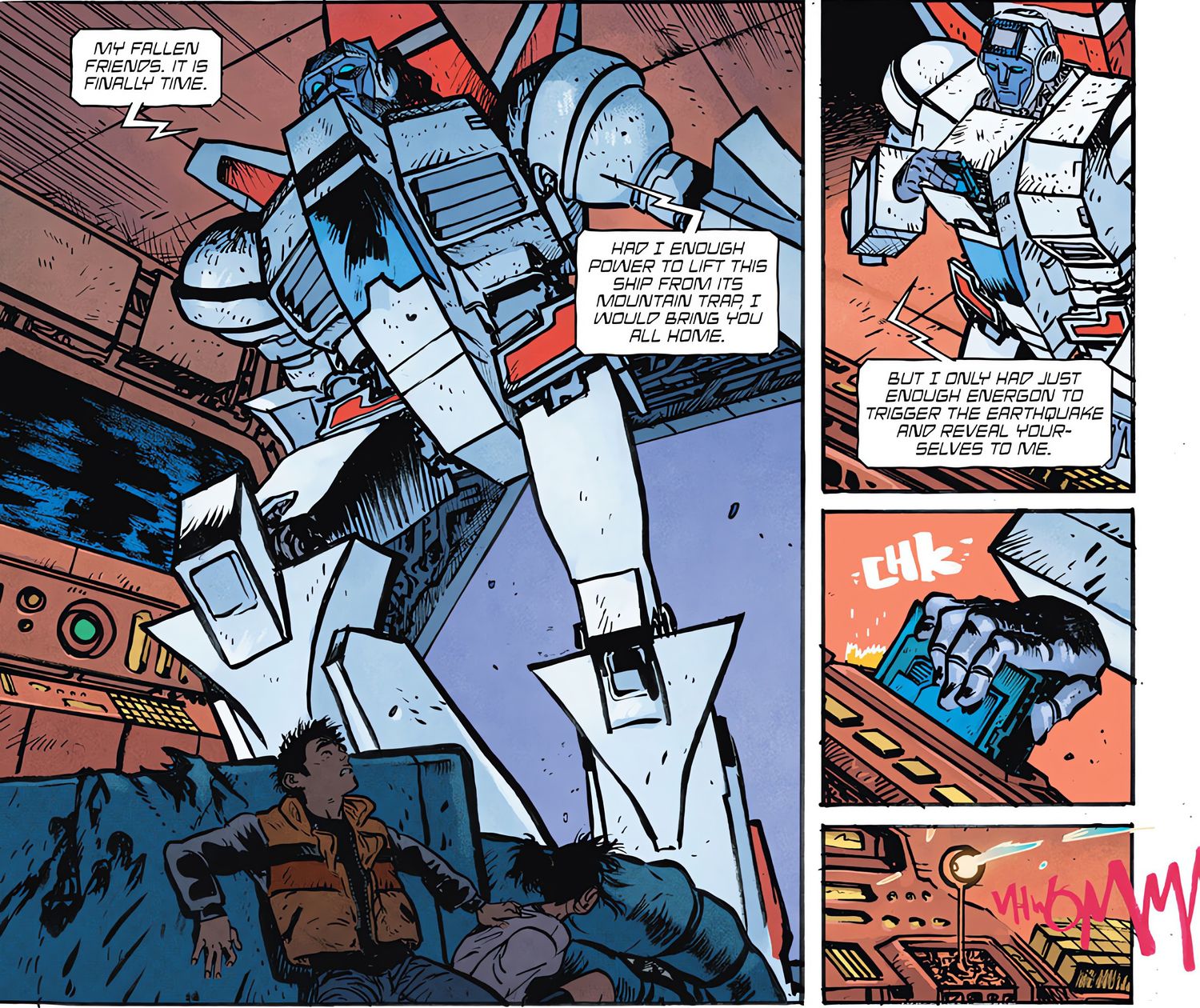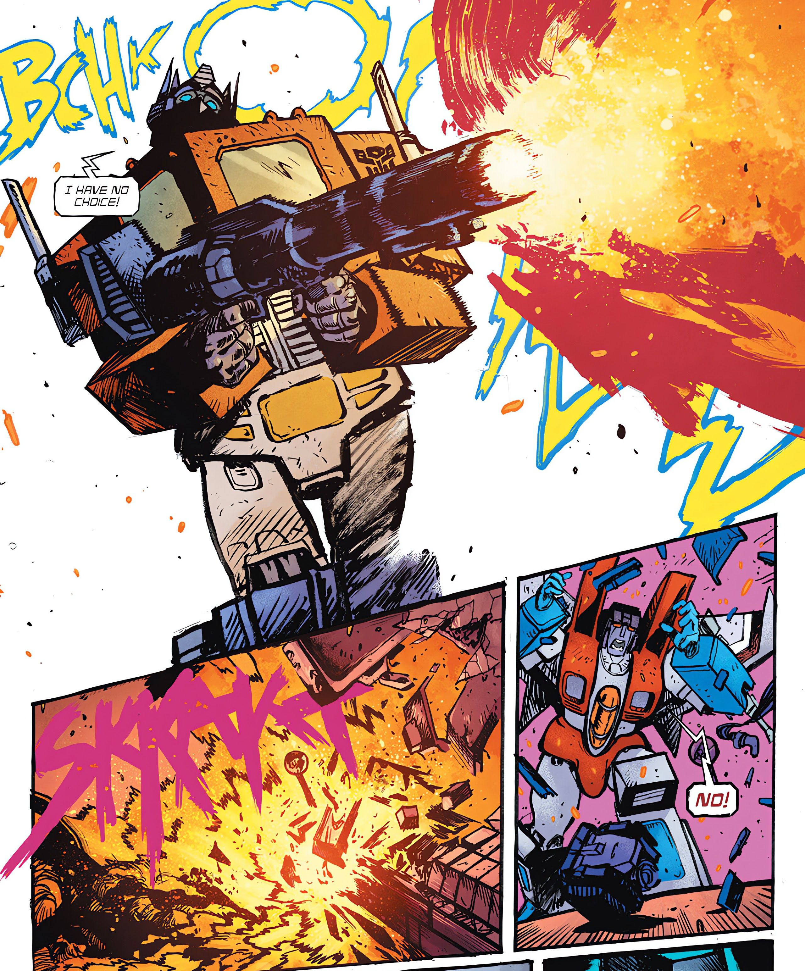 Es un momento increíble, aún más por lo que promete para el futuro de la franquicia en el Universo Energon. Optimus dejó Cybertron con una banda de Autobots para buscar en el universo Energon, la fuente de energía menguante de los Transformers. Fueron atacados por Starscream y los Decepticons, quedando varados en la Tierra y en coma durante los siguientes siglos. Ahora que finalmente han vuelto a despertar, se encuentran en una situación aún más desesperada que antes. Con apenas suficiente Energon para seguir funcionando, tanto los Autobots como los Decepticons se enfrentan a una extinción completa y total. Optimus destruir Teletraan es similar a destruir la última oportunidad de supervivencia de su raza, todo con la esperanza de poder salvar al puñado de Autobots con los que puede escapar en el primer número.