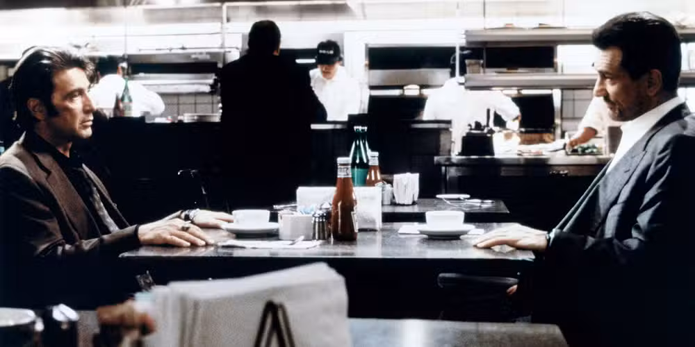 Sin embargo, no compartieron la pantalla hasta su escena de restaurante 21 años después en Calor. El estatus icónico de la película está cimentado por su legado de ser la primera película que presenta a las dos estrellas en la misma toma. Cada reseña de Michael Mann Calor elogia su química mientras cenan a pesar de ser personajes en lados opuestos de la ley.