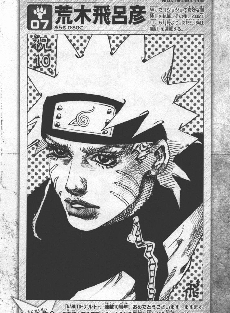 Para de naruto décimo aniversario en 2009, nortearuto Secreto: Libro de fans oficial de Scroll of Everyone fue lanzado. El libro vio a una amplia variedad de creadores de manga unirse para celebrar la histórica serie. De particular interés fue una obra de arte de Akira Toriyama y Kishimoto que representa los lugares de intercambio de Naruto y Goku. Sin embargo, la pieza más polémica entre los fanáticos fue fácilmente la representación de Naruto de Araki. Lejos del estilo de Kishimito, esta versión de Naruto tenía todas las características de un Jojo personaje como la cara muy detallada y una expresión puchera. Desde su debut, los fanáticos han estado divididos sobre qué hacer con él.