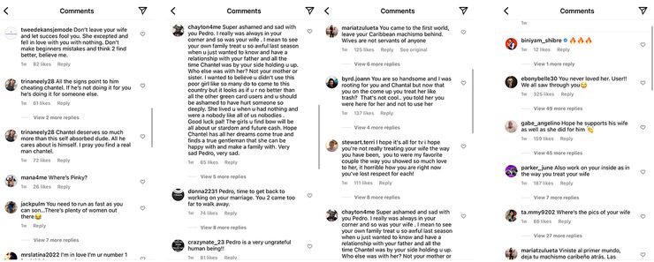 Muchos espectadores instaron a Pedro a hacer que su matrimonio con Chantel funcionara, ya que algunos aún no estaban familiarizados con la noticia de que Pedro había solicitado el divorcio. “No dejes a tu esposa y deja que el éxito te engañe”, advirtió un usuario a Pedro. “Todos los indicios apuntan a que engaña a chantel,“, intervino uno de los muchos espectadores escépticos”.También trabaja en tu interior como en la forma en que tratas a tu esposa.“, escribió otro espectador, en respuesta a Pedro mostrando los resultados de su gimnasio. Pedro recibió elogios de Prometido de 90 días miembro del reparto, Biniyam Shibre. En tanto, a su compañera de trabajo Antonella Barrenechea le gustaron las imágenes en topless de Pedro. Muchos espectadores han especulado que Pedro engañó a su esposa con la mujer más joven, dadas sus bromas coquetas en el programa.