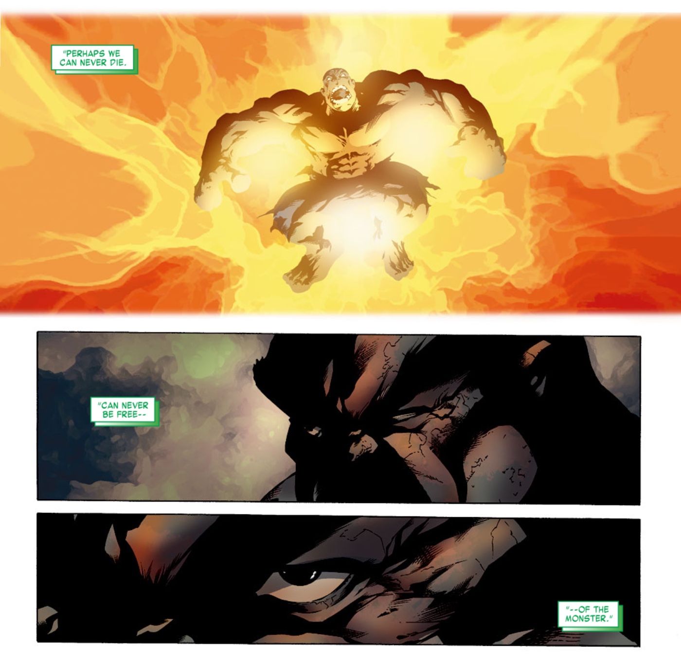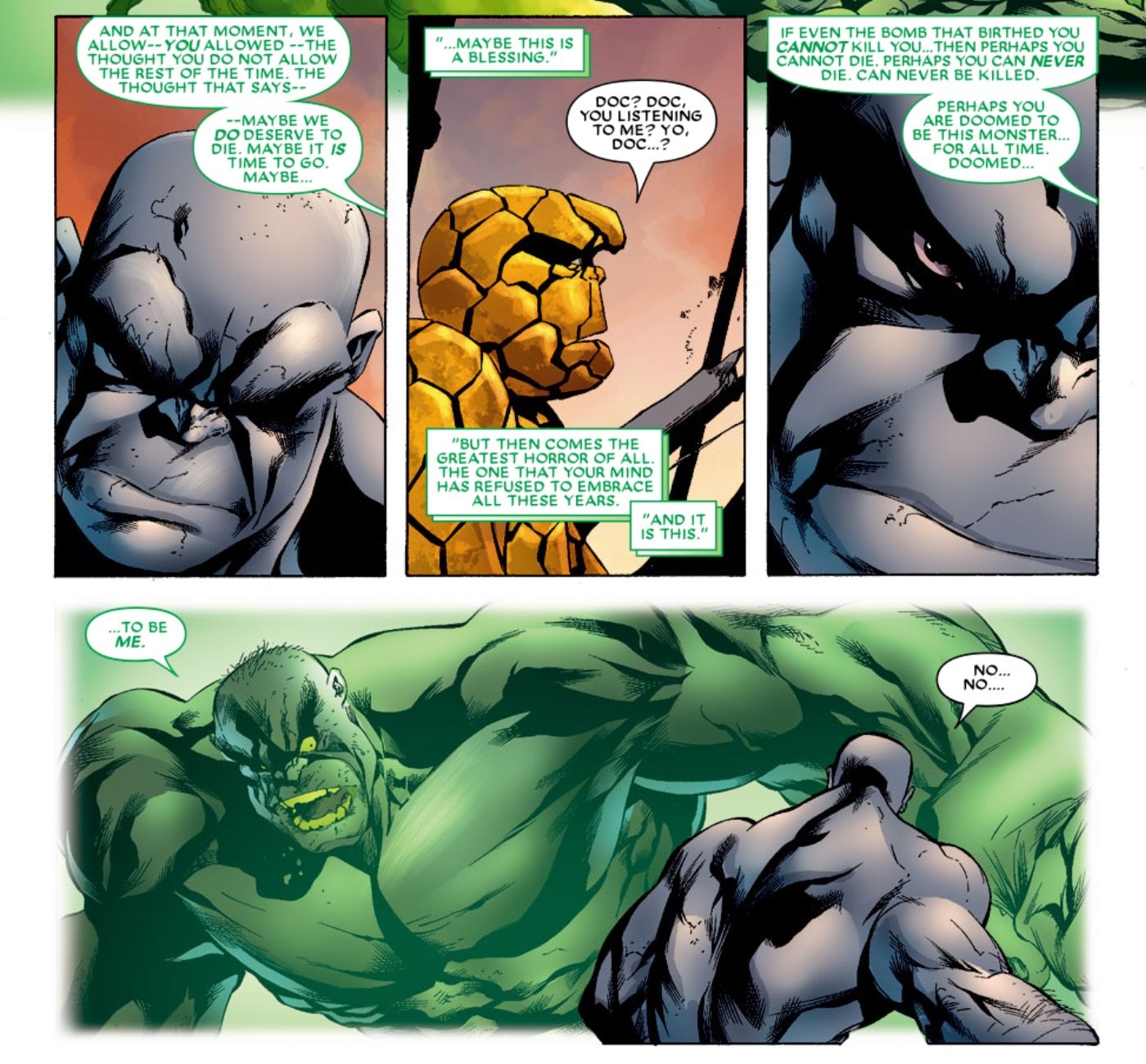 Hulk no sólo golpea a Thing hasta casi matarlo, sino que resiste un ataque de supernova de la Antorcha Humana a quemarropa sin ni siquiera un rasguño. Mientras tanto, los peores temores de Hulk le recuerdan que es un monstruo imposible de matar, lo que lo incita a una destrucción aún mayor. The Thing incluso reconoce la indestructibilidad de Hulk al final del número al bromeando diciendo que la única manera de deshacerse de Hulk es enviarlo al espacio, un plan que el Sr. Fantástico claramente se toma demasiado en serio..