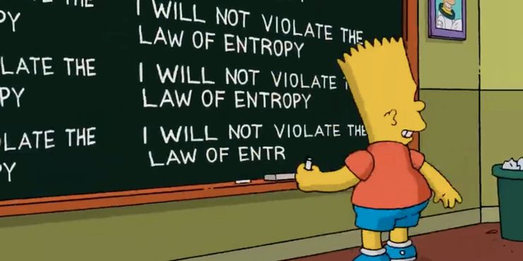A medida que el episodio reproduce los créditos iniciales al revés, la secuencia termina con Bart escribiendo “No violaré la ley de la entropía” como uno de Los Simpsons‘ gags de pizarra de larga duración. Esta línea muestra que la extraña secuencia es una metarreferencia a la trama de “Marge the Meanie”, en la que Marge y Bart se unen por su amor compartido por las bromas pesadas ambiciosas. Después de un episodio en el que tanto Bart como Marge intentaron superarse cuando se trataba de bromas, Los Simpsons en sí mismo juega una última broma al espectador al colocar los créditos iniciales al final del episodio y reproducirlos al revés.
