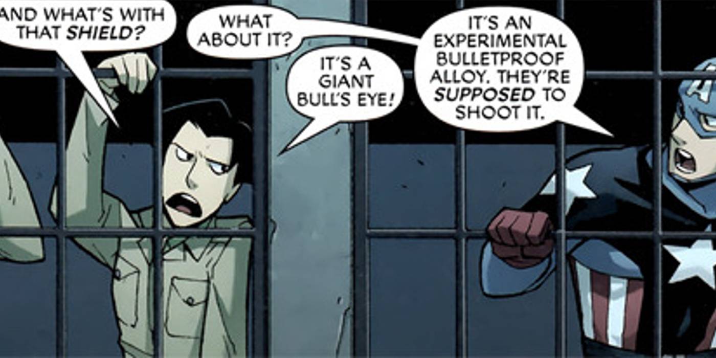 Si bien esta explicación puede parecer una excusa sin sentido para explicar la falta de lesiones relacionadas con balas en Capitan America películas, cuenta con el apoyo de Marvel Comics. En Capitán América: El vengador luchador vol. 1, lanzado por primera vez en 2011, se muestra a Steve argumentando por qué el diseño de su escudo tiene sentido. Después de que el escudo es criticado por parecerse a una diana gigante, Steve afirma que ese es el punto. Dice que el diseño significa que se supone que los enemigos deben dispararle, protegiéndolo del fuego.