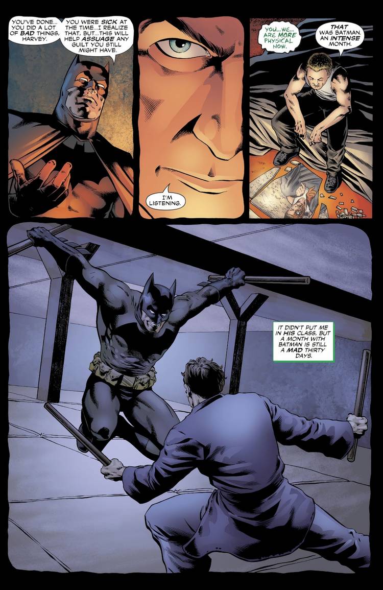En este punto de la línea de tiempo de DC, Se supone que Harvey Dent se ha curado por completo del personaje de Dos Caras.. Se había sometido a una cirugía para arreglar su rostro y parecía estar legítimamente tratando de enmendar los crímenes que había cometido. Batman señala estos acontecimientos él mismo cuando Harvey intenta rechazar la oferta. Dice mucho de lo que Batman siente por Harvey Dent que no solo lo nombra como el único protector de Gotham, sino que también entrena a Harvey sobre cómo luchar para que pueda proteger efectivamente a Gotham.