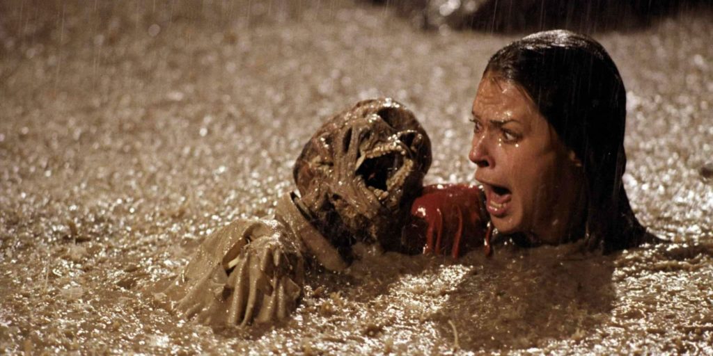 En una de DuendeEn las escenas más memorables, el pensamiento desaparecido Bestia intenta recuperar a Carol Anne, con la casa de Freeling volviéndose absolutamente loca en el proceso. Durante esto, Diane Freeling (JoBeth Williams) es enviada involuntariamente a darse un chapuzón en la piscina de la familia, ahora llena de barro gracias a la fuerte lluvia que cae. Ah, sí, y como Diane pronto se da cuenta, también está lleno de cadáveres. Las personas enterradas debajo de su casa exigen ser escuchadas, en forma de asustar a los Freelings con sus horribles esqueletos.