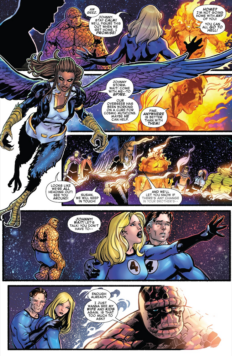 En Cuatro Fantásticos #45, escrito por Dan Slott con arte de Fared Karami, tiene lugar el gran final de Reckoning War: Reed Richards acaba de disparar el Ultimate Nullifier, que borra la amenaza que la especie Reckoning representaba para el universo. En el proceso, borra la parte del Vigilante del cerebro de Reed, que contenía un conocimiento incalculable del supositorio de información del Vigilante, incluida una forma de curar a Johnny. Cuando Reed revela que ha perdido la información para una cura, Johnny se enfurece y finalmente decide dejar los Cuatro Fantásticos por el planeta Spyre.