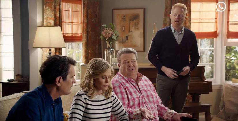 En un gran momento para Familia moderna aficionados, Cuatro miembros del elenco repitieron sus papeles en un nuevo comercial de televisiónEl anuncio era para la aplicación WhatsApp, y no solo aparecían como sus personajes, sino que repetían a la perfección sus famosos papeles. Se veía a Phil y Claire sentados en el sofá y hablando con Cam sobre las nuevas fotos que habían conseguido de los hijos de Haley. Mitchell entró y quiso ver las fotos, pero Phil le dijo accidentalmente que estaban en su chat grupal, lo que confundió a Mitchell, que fue expulsado del chat.