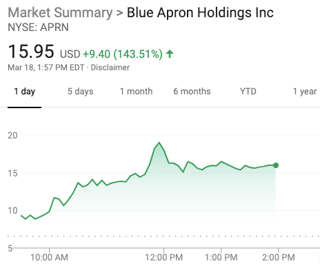 Hasta ahora. De repente, Blue Apron es la acción más caliente del mundo, y se disparó a medida que otras compañías perdieron valor. Hoy en el comercio regular, estadounidense los índices cayeron tanto que dispararon interruptores de protección. Al mismo tiempo, Blue Apron estaba haciendo esto (a través de Google Finance):