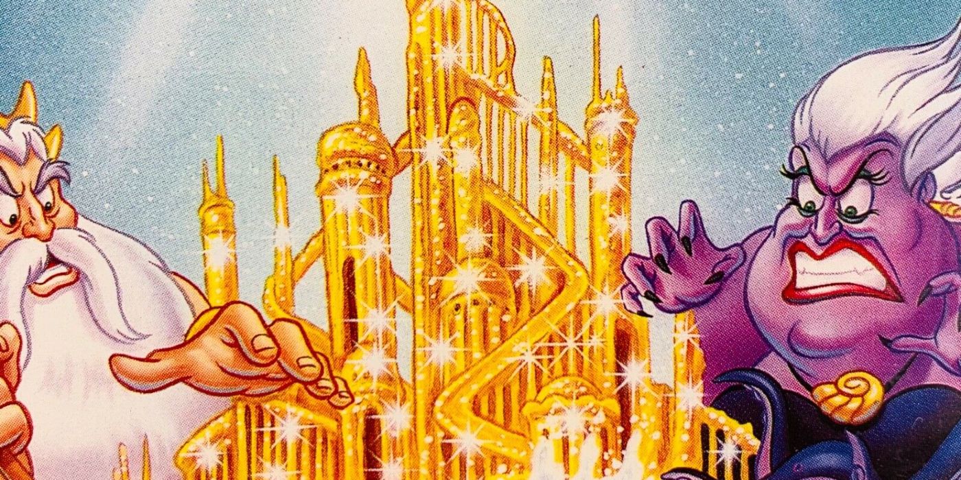 “/> La Sirenita se lanzó en VHS después de su éxito en los cines con una nueva obra de arte creada para la portada. La obra de arte muestra a Ariel, Eric, Ursula y el rey Tritón frente al castillo de Tritón. El castillo de Tritón ocupa un lugar central con sus agujas doradas y brillantes y se utiliza para evitar que Ursula y Tritón enojados lleguen a los amados Ariel y Eric. La imagen parece bastante inocente al principio, pero una mirada más cercana revela que el castillo del Rey Tritón parece contener algunas imágenes inapropiadas.