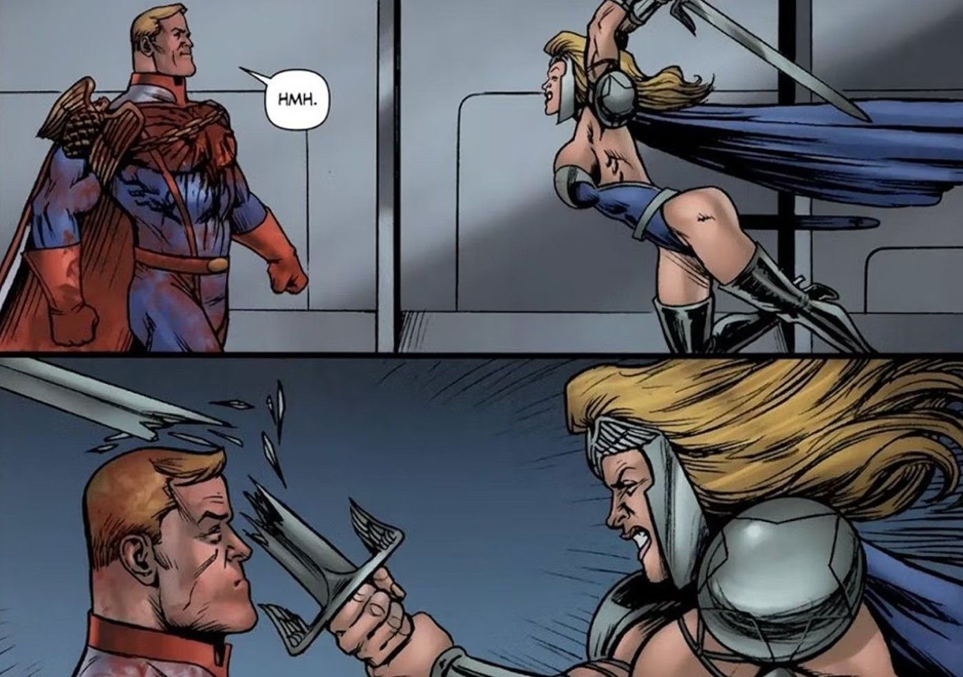Sin embargo, Maeve no tuvo más remedio que involucrarse en uno de Los chicos’ tramas más dramáticas. En Los chicos #63 por Garth Ennis y Russell Braun, la reina Maeve se da cuenta de que Starlight está empacando sus cosas y se está preparando para dejar a los Siete para siempre. Los dos se despiden y Maeve acompaña a Starlight mientras se va. Sin embargo, los Supes se enfrentan a Homelander, cuyo plan para derrocar al gobierno de los EE. UU. está en pleno apogeo. Mientras Homelander avanza para matar a Starlight, Maeve salta en defensa de Starlight. Ella trata de ganar tiempo arrojando a su asistente a Homelander, solo para lograr matar a su asistente. Maeve agarra una espada y ataca a Homelander de frente, pero descubre que su arma es solo un accesorio. Con poco esfuerzo, Homelander golpea la cabeza de Maeve de su cuerpo y la envía volando más allá de Starlight.