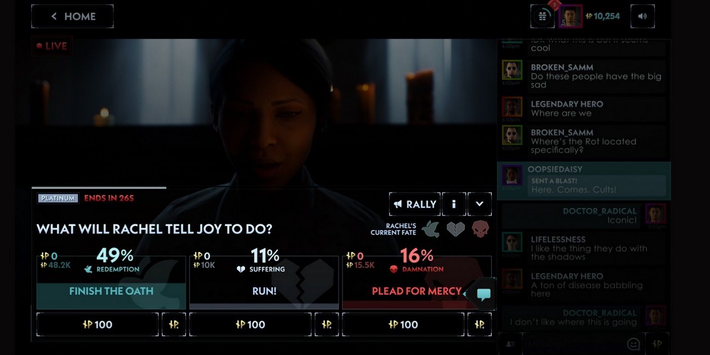 Como tal, los espectadores sin dinero para gastar Ascensión pueden terminar sintiéndose despreciados por la injusticia de este sistema monetario y la forma en que minimiza el poder de su opinión. En estas situaciones, la mayor contribución que pueden hacer los espectadores que no desean gastar dinero Ascensión Lo que puedes hacer a la historia es participando en las secuencias de persecución y partes de combate donde la comunidad trabaja en conjunto para ayudar al personaje a sobrevivir o condenarlo a ser asesinado por el monstruo. Pero considerando la cantidad de personas que trabajan juntas en esas secuencias, puede que no parezca suficiente para compensar el sistema de votación.