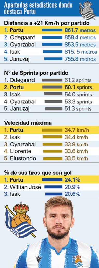 No es la única estadística que revienta Portu puesto que lidera la lista de jugadores de la Real que más corren realizando un sprint. Al extremo realista se le queda pequeña la banda derecha de Anoeta puesto que recorre 861 metros por partido a más de 21 km/h. Unos pulmones preparados para todo. Odegaard (858 m), Oyarzabal (853m), Isak (815m) y Januzaj (755) completan el ranking. Asimismo, el noruego y el español son los dos jugadores realistas que más sprints realizan por partido. El vikingo hace 61, mientras que Portu se ‘deja el alma’ 60 veces por encuentro con la Real.