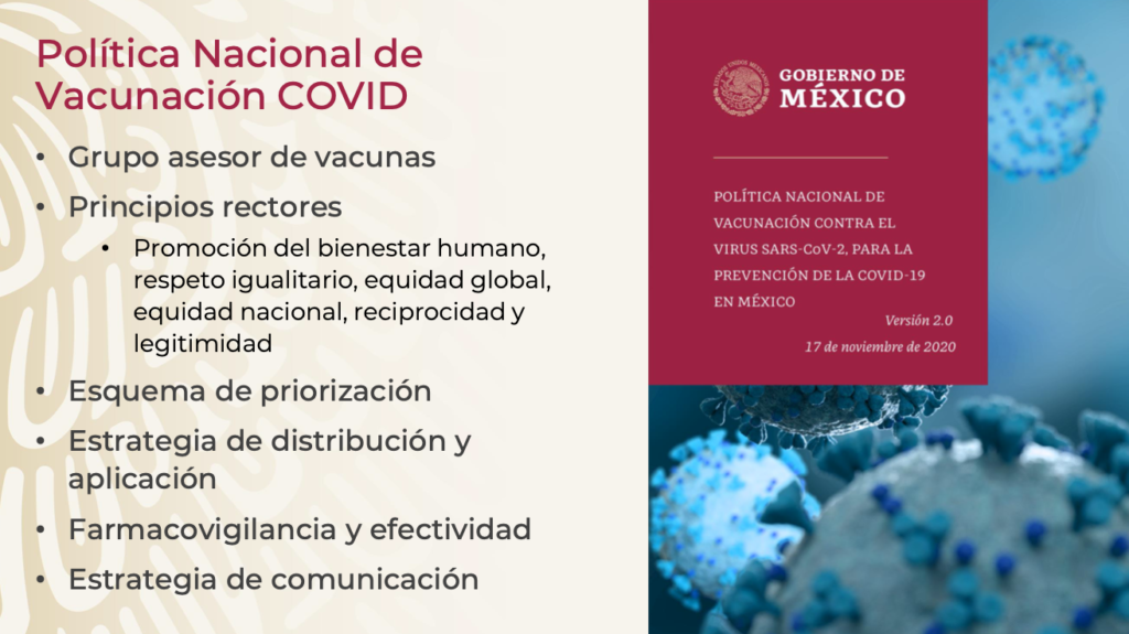 Previamente, López-Gatell adelantó que en próximos días anunciarán oficialmente el documento Política Nacional de Vacunación Covid-19, el cual fue abordado con ayuda de un grupo asesor de vacunas contra el coronavirus, y posee los principios rectores sobre el esquema de priorización, estrategia de distribución y aplicación, fármaco-vigilancia y efectividad, así como una estrategia de comunicación en México.