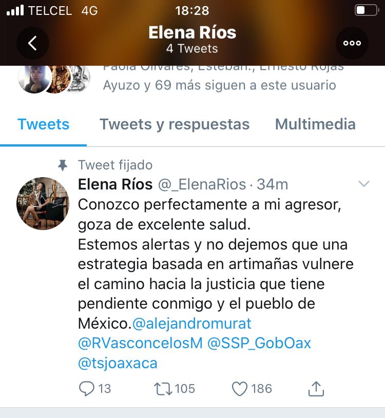Por su parte, María Elena Ríos Ortiz de 27 años de edad a través de su cuenta de twitter dijo que se trata de una “estrategia basada en artimañas” y que estará alerta a lo que ocurra con su agresor, porque dijo que la justicia está pendiente con ella y con el pueblo de México.