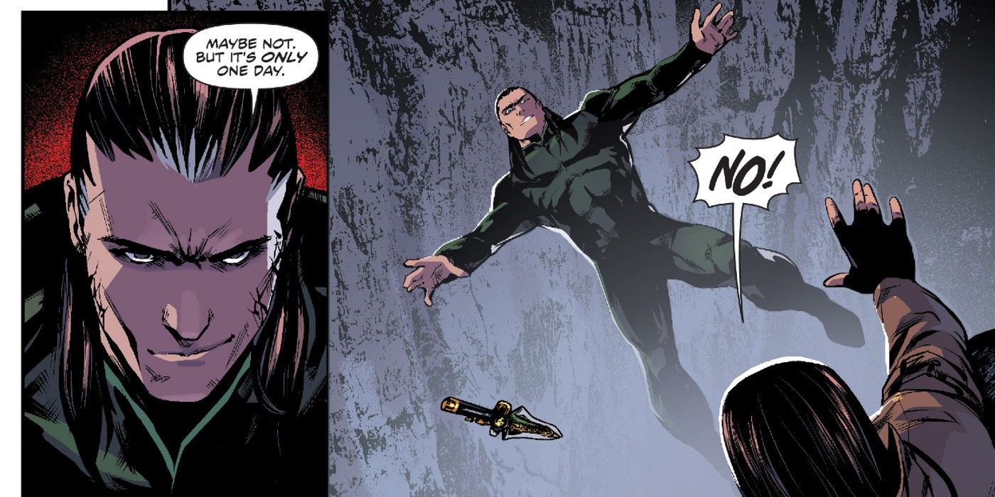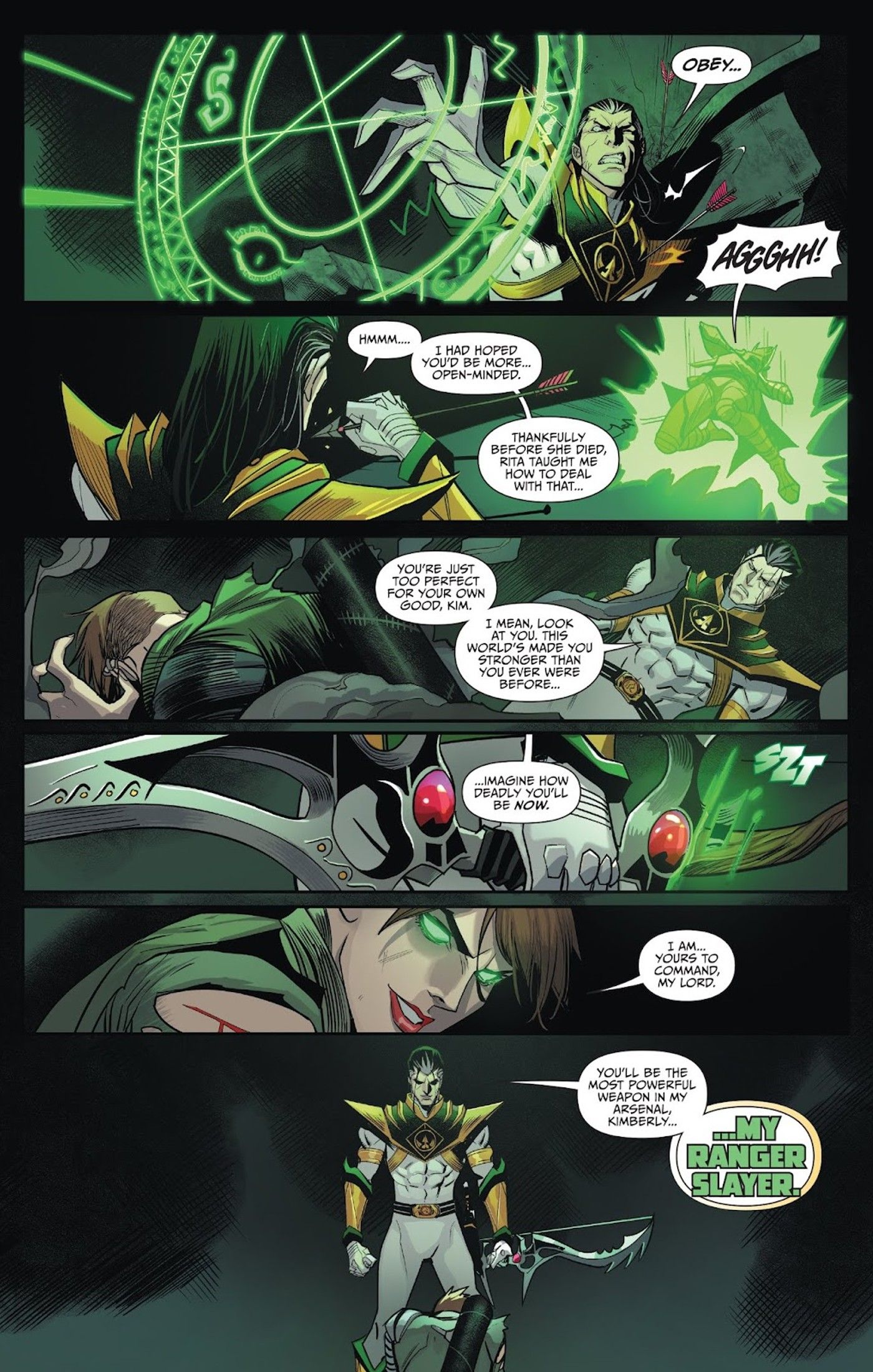 Con la historia de “Shattered Grid” comenzando oficialmente en este número, Lord Drakkon no perdió el tiempo aprovechando al máximo su nueva libertad cazando al protagonista de la continuidad Tommy Oliver. Después de engañar a Ninjor para que le devolviera sus poderes, Drakkon quiso potenciar el Cristal Verde original que le dio a Tommy sus poderes. Drakkon no podría haber elegido un momento más trágico, ya que Tommy acababa de concluir su primera cita con Kimberly. Segundos antes de que hubieran compartido su primer beso, Drakkon apareció detrás de Tommy y lo apuñaló por la espalda. El alma de Tommy resurgiría a través del espacio y el tiempo, gracias al Ranger Slayer, pero físicamente, Murió ese día y estuvo desaparecido durante la mayor parte del tiempo. Cuadrícula destrozada como resultado.