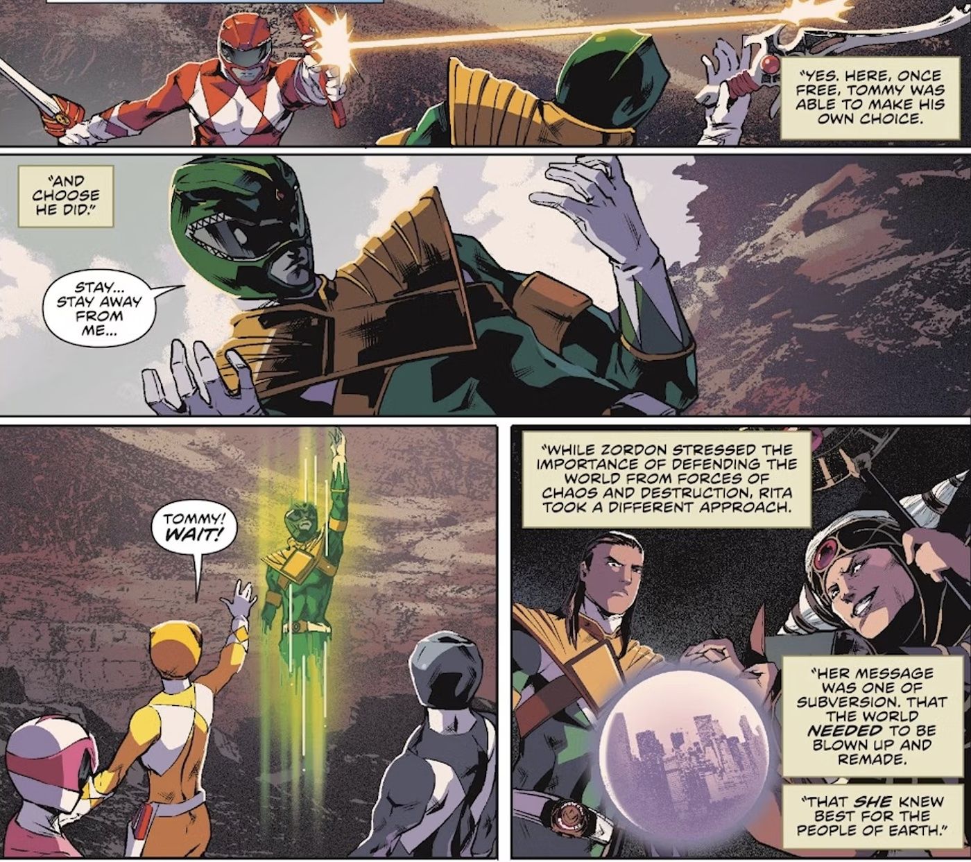 El arco “Shattered Grid” analiza una realidad alternativa a la que a menudo se hace referencia como el mundo de los sin monedas. Este mundo ha sido conquistado por Lord Drakkon, una versión malvada de Tommy Oliver que nunca se apartó del lado de Rita. Sus orígenes y cómo se diferencian del canon principal se pueden ver de primera mano en Mighty Morphin Power Rangers #12 por Kyle Higgins, Hendry Prasetya, Matt Herms y Ed Dukeshire. Al igual que en el canon principal, los Rangers pueden romper el hechizo de Rita, excepto que esta vez, los Rangers literalmente extienden sus manos hacia Tommy, solo para que él huya con la cabeza llena de confusión y libre albedrío recién descubierto. ¿Suena familiar? A partir de ahí, Tommy elige seguir siendo malvado al lado de Rita, y finalmente se convierte en Lord Drakkon.