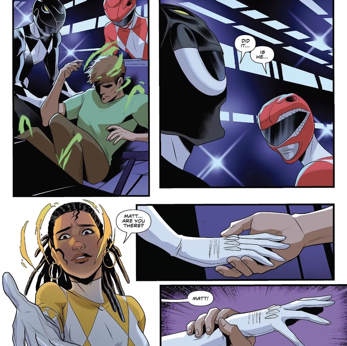 Los Rangers finalmente pueden romper el hechizo de Rita en Mighty Morphin Power Rangers #109 por Melissa Flores, Simona Di Gianfelice, Raúl Angulo, José Enrique Fernández, Ed Dukeshire, Madison Goyette, Kenzie Rzonca y Allyson Gronowitz. Los Rangers literalmente extienden sus manos hacia Matthew. Sin embargo, mientras su cabeza está inundada por la confusión y el nuevo libre albedrío, huye. Cualquiera que esté familiarizado con la historia de “Shattered Grid” puede ver algunos paralelismos inquietantes entre esta escena y la historia del origen de Lord Drakkon.