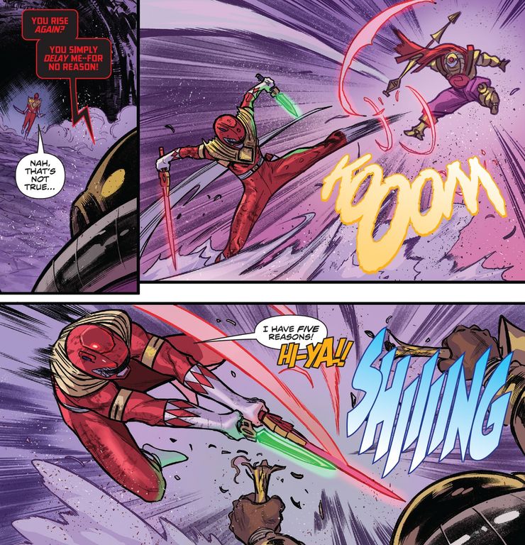 el rojo y el verde Guardabosques han combinado su poder en el último número de BOOM! Estudios Poderoso Morphin’ serie. El movimiento tiene un precedente en la tradición de la franquicia: en la película de dos partes, “The Green Candle”, para evitar que Rita Repulsa le quite la vida a Tommy y los poderes del Green Ranger, él transfiere sus poderes al Red Ranger Jason, dándole su Dragon Shield. y Dagger, así como los poderes que vienen con ellos.