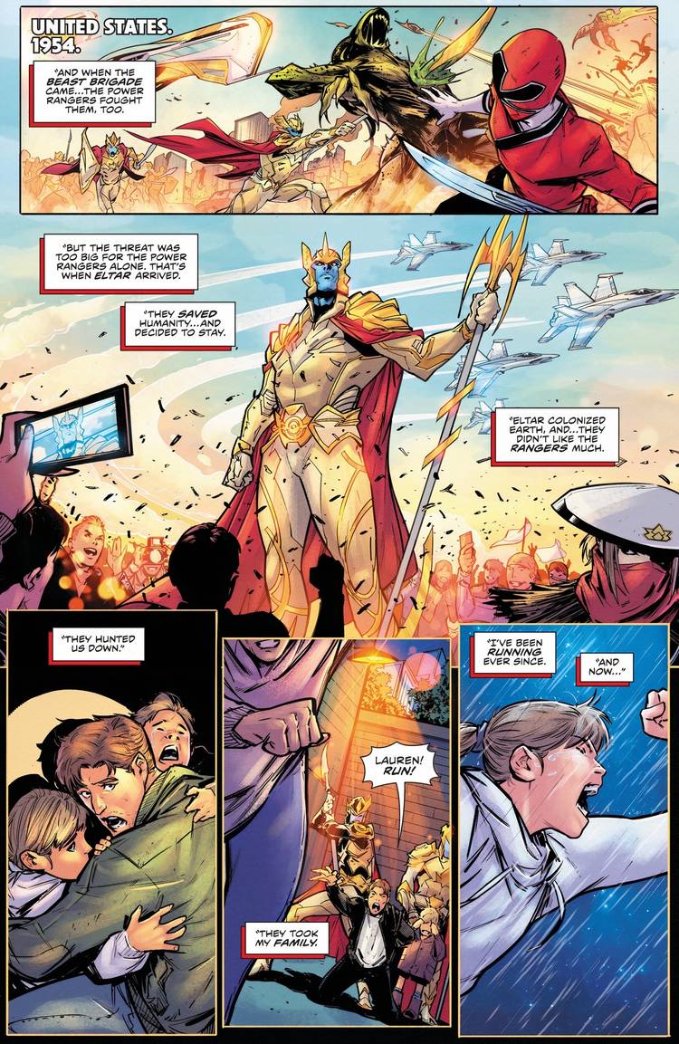 En Power Rangers Prime #1 de Melissa Flores y Michael YG, a los lectores se les presenta un universo de Power Rangers como ningún otro. De buenas a primeras, se revela que los Power Rangers están muertos, y cualquiera que de alguna manera todavía tenga alguno de sus artefactos (como un morpher o una moneda de poder) es perseguido por oficiales de la ocupación extraterrestre. Sí, la Tierra ni siquiera pertenece a los humanos en esta continuidad, ya que la raza eltariana tomó control del planeta décadas antes de los eventos de este número. ¿Cómo lo hicieron? Simple: los eltarianos mataron a los Power Rangers.